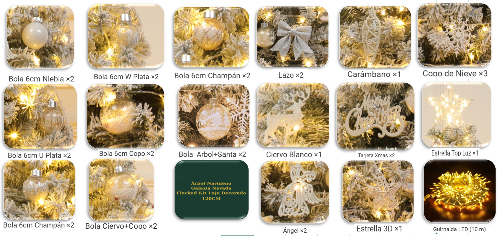 Los paquetes de bolas navideñas incluidos no son adornos comunes, sino constelaciones de lujo. Cada esfera aporta un matiz distinto —pureza, magia, serenidad y elegancia— y juntas crean un universo navideño cálido y soñado.