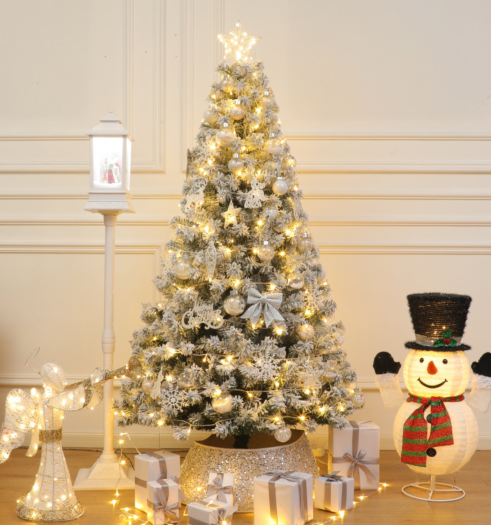El Árbol de Navidad Galaxia Nevada Flocked – Kit Decorado con Detalles Exclusivos · Edición de Lujo Top Configuración transforma tu hogar en un firmamento de nieve y estrellas. Cada adorno destella como un fragmento de la galaxia invernal, creando una atmósfera mágica, elegante y eterna.