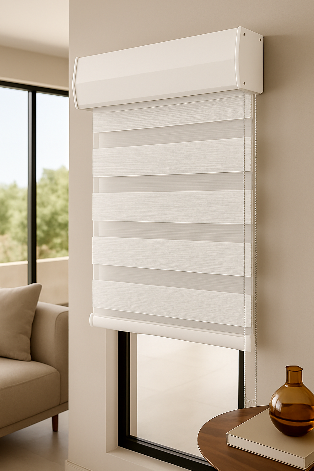 Cortina Roller Duo 100%Blackout Chenilla Con Cenefa Curva Aluminio Versión mejorada Cenefa Geométrica